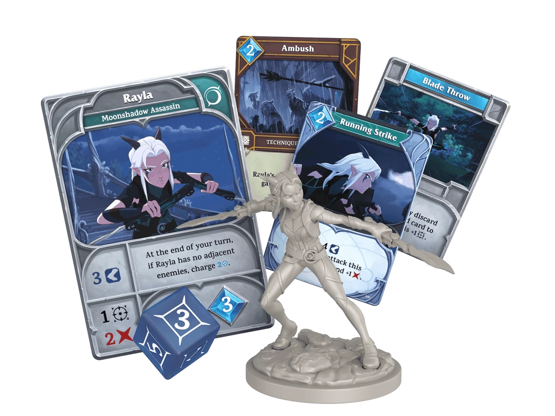 The base game includes eight characters: Rayla, Ezran, Callum, Amaya, Janai, Viren, Claudia, and Soren. Each is represented with a high-quality miniature, a hero card, and a 16-card deck.