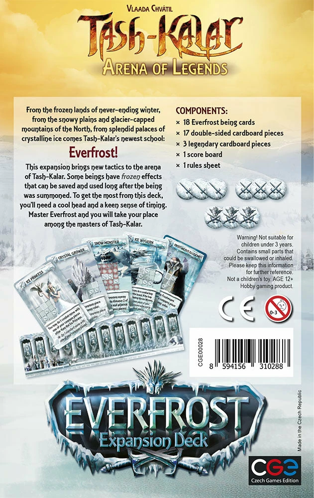 Tash-Kalar: Arena of Legends – Everfrost consists of a new faction for use with the Tash-Kalar: Arena of Legends, a deck of powerful beings that live in the frozen lands of never-ending winter on snow plains, on cold mountains or in palaces of ice.