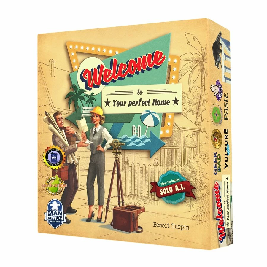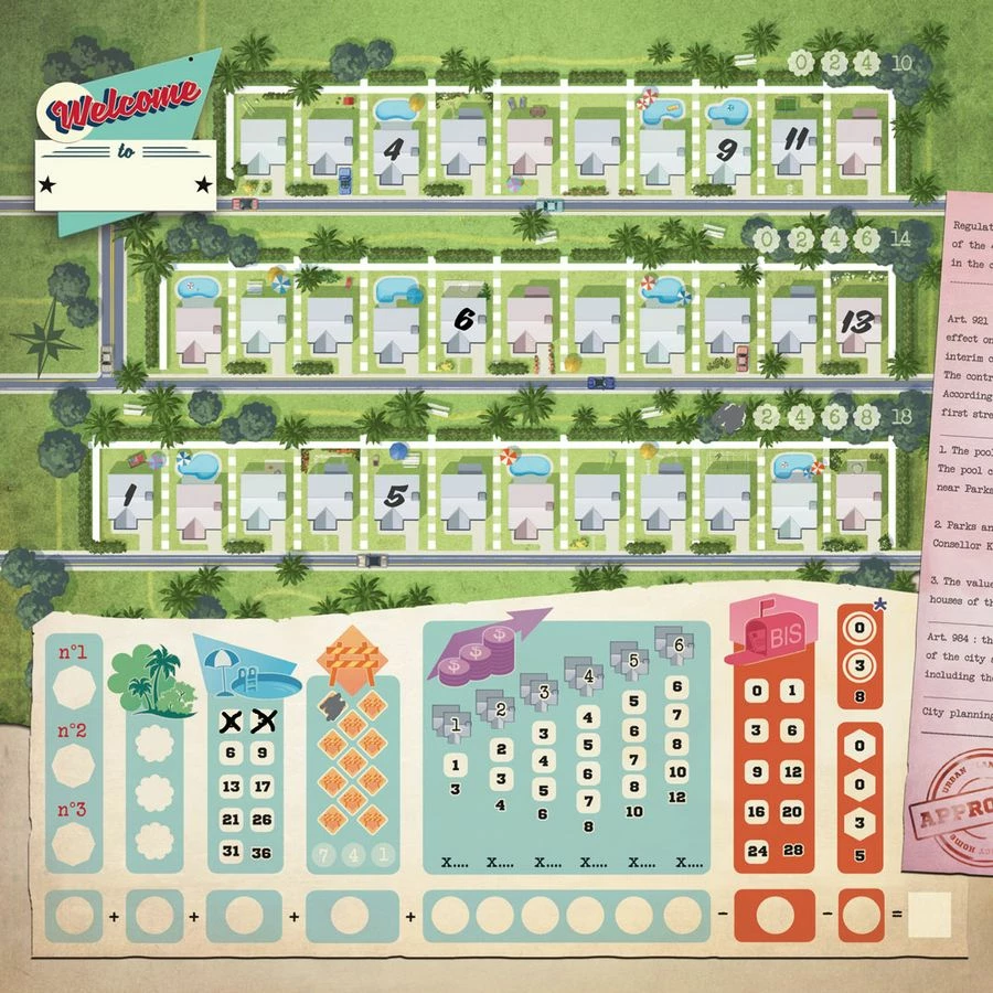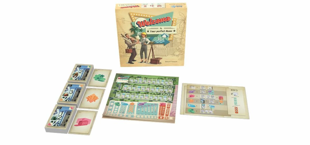 Welcome To… plays like a roll-and-write dice game in which you mark results on a score-sheet…but without dice. Instead you flip cards from three piles to make three different action sets with both a house number and a corresponding action from which everyone chooses one. You use the number to fill in a house on your street in numerical order. Then you take the action to increase the point value of estates you build or score points at the end for building parks and pools. Players also have the option of taking actions to alter or duplicate their house numbers. And everyone is racing to be the first to complete public goals. There’s lots to do and many paths to becoming the best suburban architect in Welcome To…!