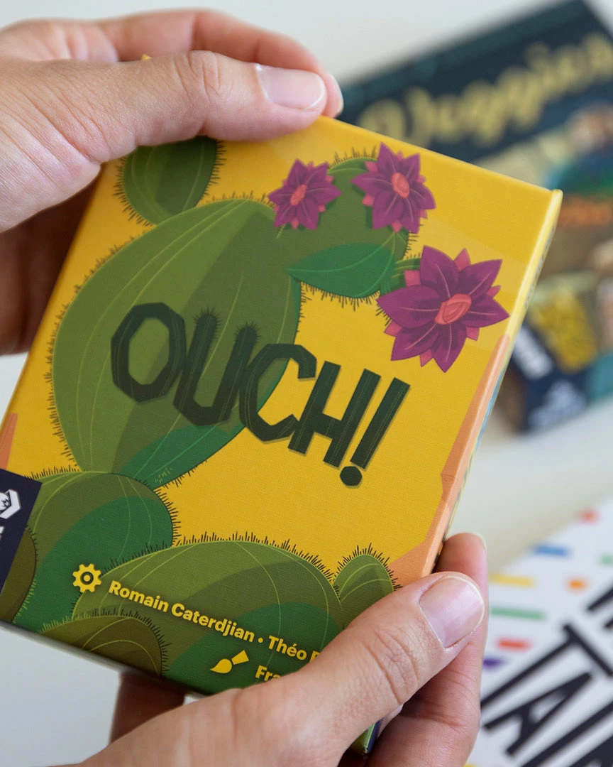 Ouch! is a game for the whole family, especially for the younger ones. In this game players will take turns choosing the Cactus card with the prettiest flowers they want to bring over to their collection. Before taking the card they’ll need to indicate which side of the card they will touch, and then flip it handling only that side of the card. If the reverse is clear on that side, they can take the card and score that number of flowers. If the reverse shows a cactus full of thorns, they will lose the card.