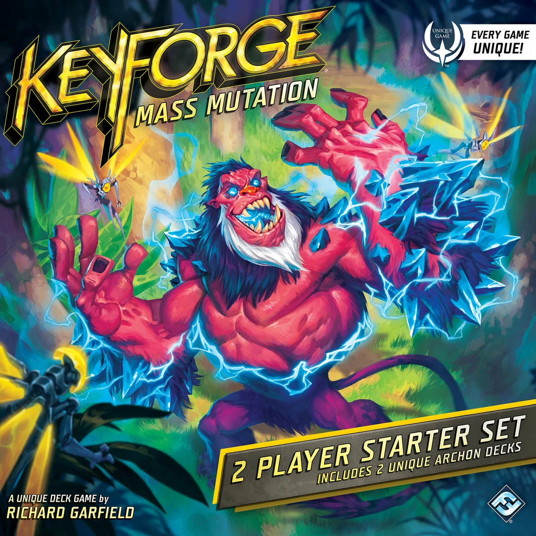 Each Mass Mutation Two-Player Starter Set contains two ready-to-play 36-card decks, bringing together three of the diverse Houses of the Crucible—each featuring their own mix of cards and unique from every other Archon Deck in existence. You’ll also find all of the tokens that you need for two players to start playing KeyForge!
