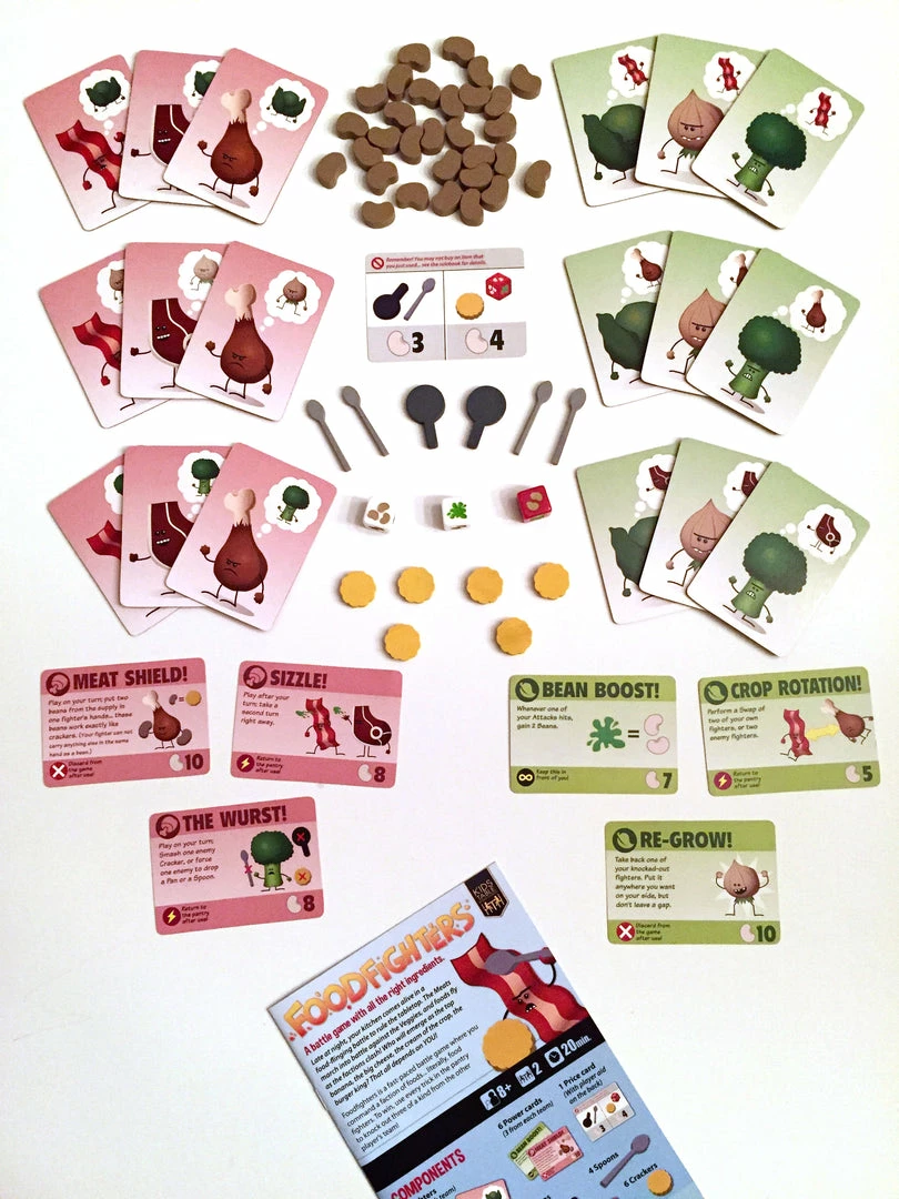 You and your opponent each control a faction of fighting foods. On your turn, you can move a Foodfighter, or roll dice to attack an opponent (that your Foodfighter is thinking about and that is in reach), or roll for Beans (cash). After that you can spend your Beans to buy awesome gear from the store or Power cards that are unique to your team. Then it’s the other guy’s turn. Keep going until you’ve knocked out three of a kind on your opponent’s team, and you’ve won!