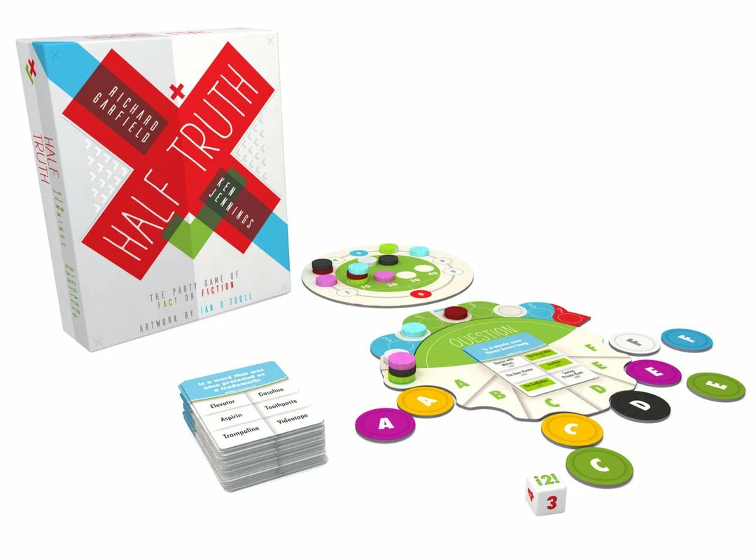 Half Truth is a party game for all ages and people, created by legendary game designer Richard Garfield and 74-time Jeopardy winner Ken Jennings. With art by well-known artist Ian O’Toole, the game comes with 500 trivia question cards and each card has a category on it, like “Animals with blue tongues.” There are six possible answers, three right and three wrong, and players have to place bets on answers they believe are correct.