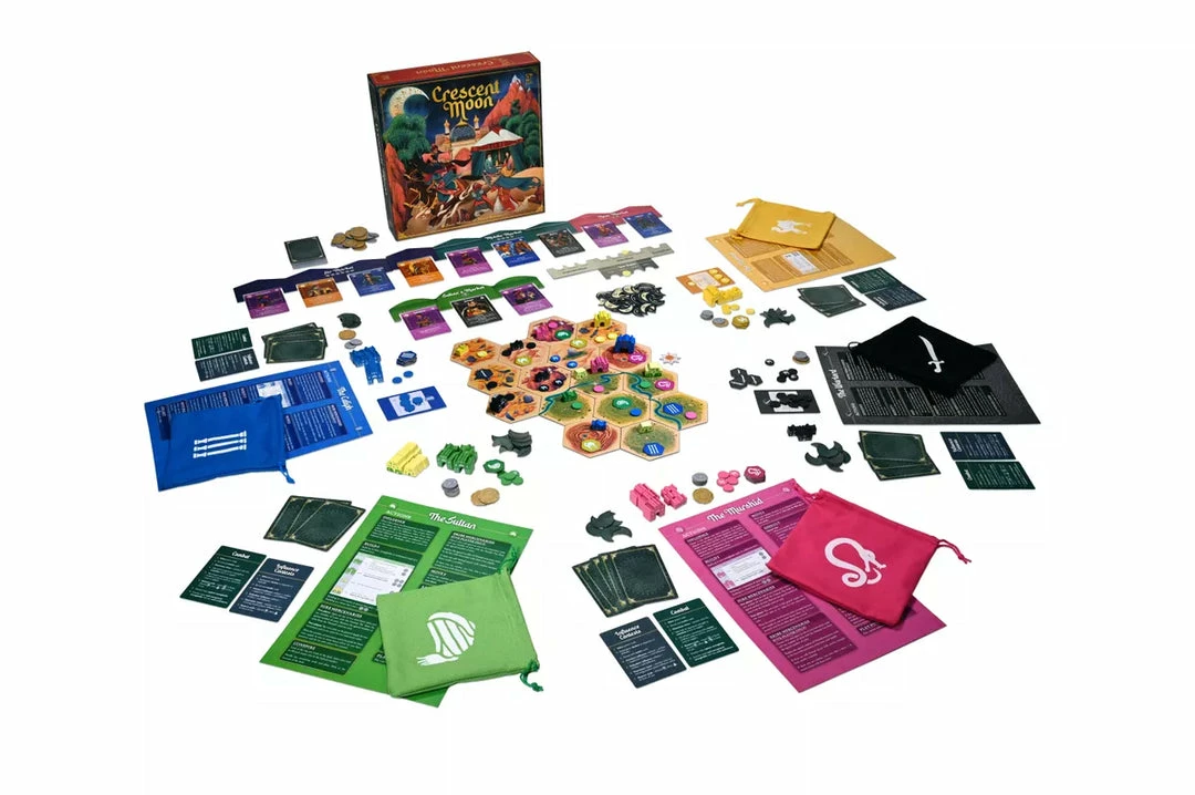 Crescent Moon is an area control game for four or five players. Take on the role of one of five radically asymmetric characters, each with their own objectives to fulfil, unique actions to utilise, and game-changing special powers to employ. Build symbiotic relationships with your allies, undermine your rivals, and choose your friends and enemies wisely in this cut-throat game of power and politics.