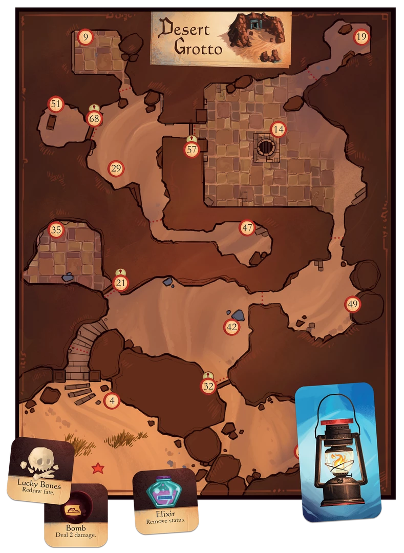 Each dungeon holds dangerous traps, vicious monsters, and treasure that you can find. Because dungeons take longer to explore than a standard location, there are a few small changes to game play when you enter one. While in the dungeon, players take turns taking two actions each, which include moving to new rooms, examining your surroundings, and more.