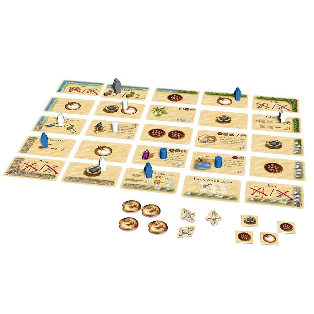 A Targi is a male member of the Tuareg people, who live in the Sahara desert. As tribe leader, you will be trading dates, salt, and pepper to obtain coveted gold coins and advantages. In the game, the desert is a five-by-five grid of cards. Position your Targi figures on the cards that border the desert. You carry out the actions of those cards as well as the cards at the crossroads between them. If you don’t go to the merchant, you won’t be able to trade — and even worse, your opponent will. Or maybe a caravan will bring the merchandise you desire. There are many choices to consider. But don’t wait too long, the desert is harsh and you might miss an opportunity to make a deal. In the next round, a completely different set of offerings will be on the table. The goods cards are the means to the end of getting highly desired tribe cards. These in turn bring advantages during the game and victory points at the end. You can win only if you plan shrewdly and always keep some gold in your pocket
